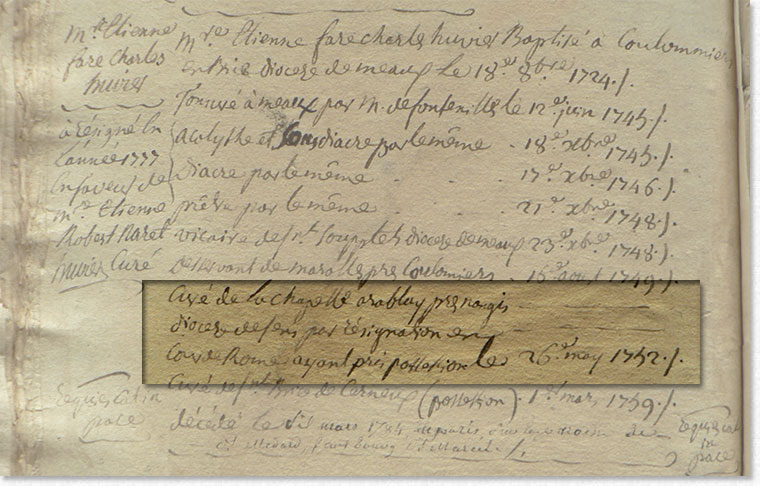 Comment Etienne Fare Charles Huvier, vicaire à Marolles en Brie, proche Coulommiers, diocèse de Meaux, eut-il connaissance de la vacance de la cure de la Chapelle Rablais, diocèse de Sens? Ses diverses "nottes" ne indiquent pas la manière dont il fut informé. Peut-être par ses relations, ou le bouche à oreille au gré du passage des petits artisans comme ces cordonniers-rémouleurs de Lorraine dont la présence à la Chapelle Rablais a été attestée ou autres colporteurs...