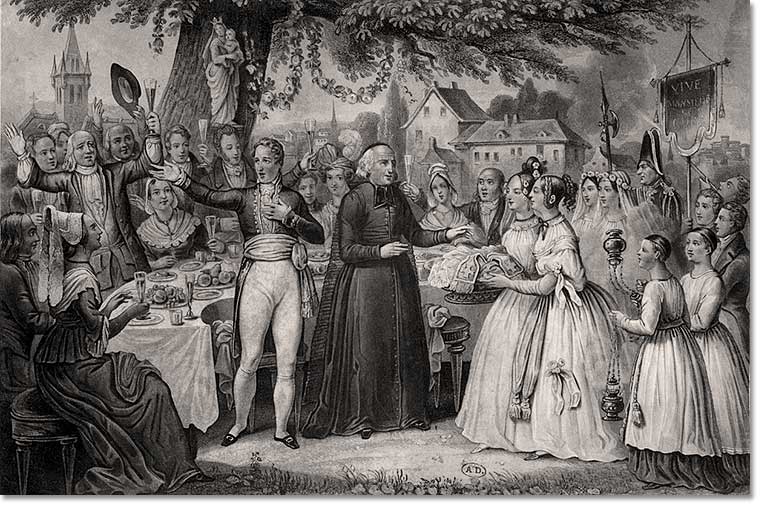 Retour de la Conférence, esquisse de Gustave Courbet; en passant la souris : la gravure. Si le vicaire Huvier assista aux conférences