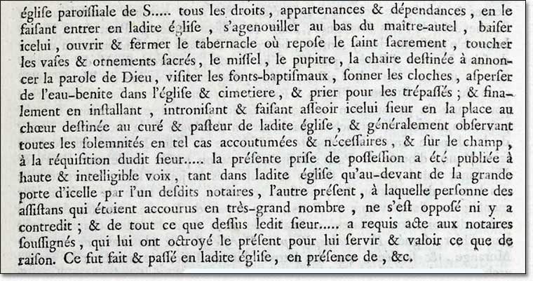Pour l'établissement du nouveau curé dans la paroisse de la Chapelle Rablais, une cérémonie eut lieu, mais le curé Huvier n'en fit pas mention dans ses "nottes" où, pourtant, il détaillait minutieusement les étapes de sa carrière; de même pour la cure de Cerneux, quelques années plus tard. On peut facilement en imaginer le déroulement, à partir de cet exemple proposé aux notaires apostoliques chargés d'authentifier une prise de possession.